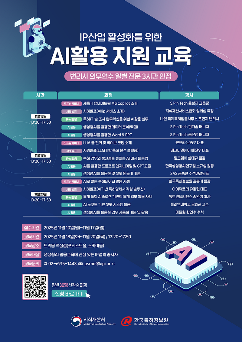 회원님의 건승을 기원합니다. 지식재산처 주최 「IP산업 활성화를 위한 AI 활용 지원 교육」 교육이 개최됩니다. 본 행사는 변리사 의무연수 전문 3시간(일별 3시간)으로 인정되오니 관심있는 회원께서는 많은 신청 바랍니다.