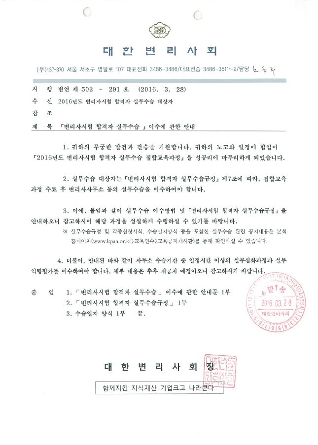 실무수습 수습일지 제출시 주소지로 등기우편으로 발송해주시기 바랍니다.