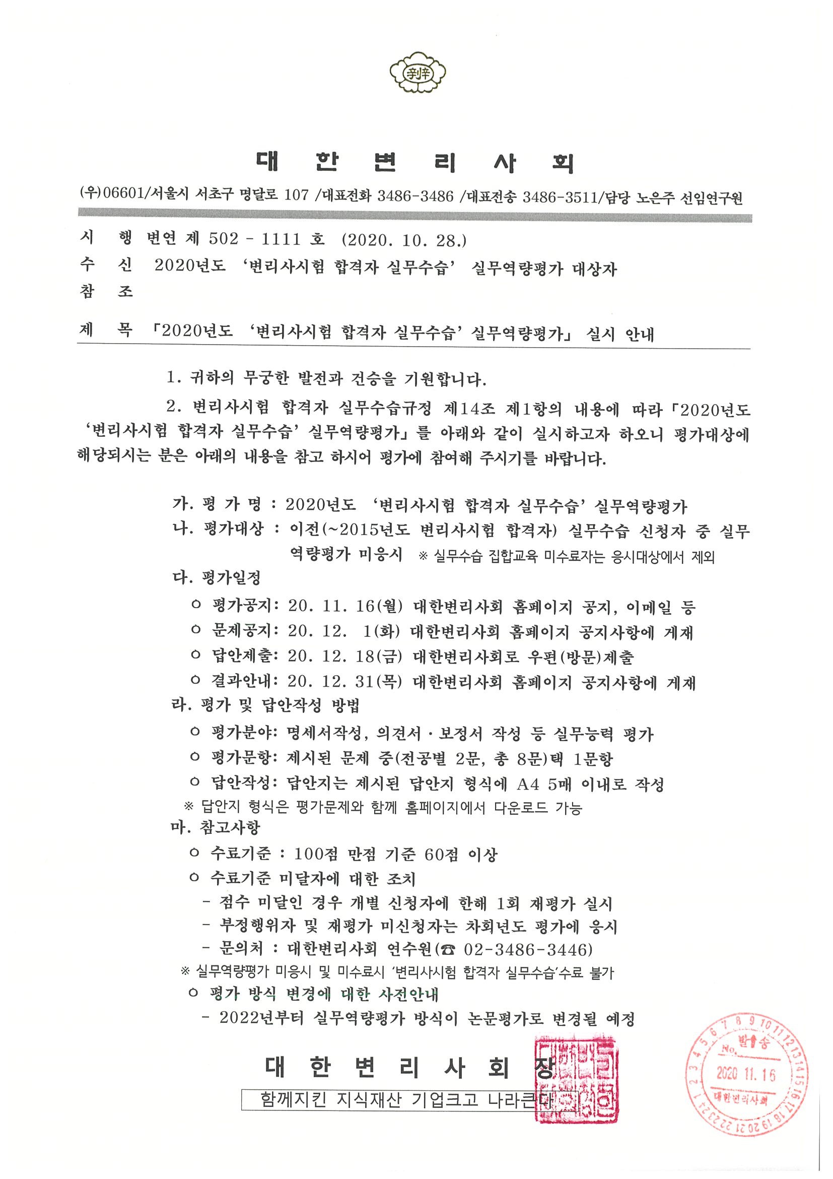 2019년도 ‘변리사시험 합격자 실무수습’실무역량평가 실시 안내