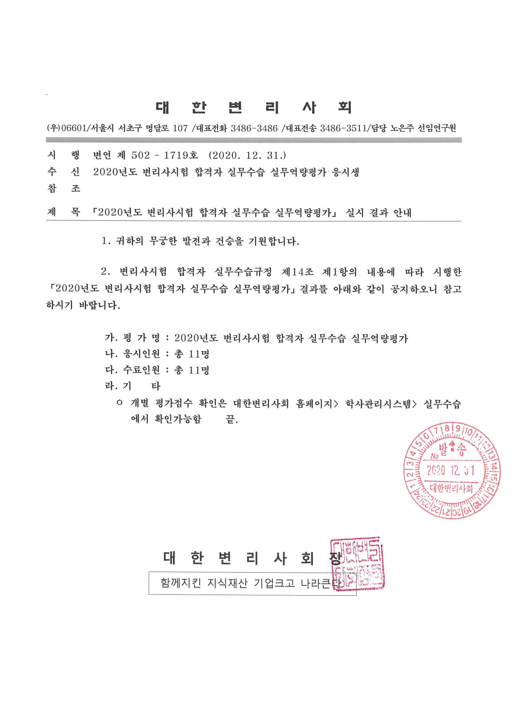 [실무수습]2020년도 변리사시험합격자 실무수습 실무역량평가 실시 안내