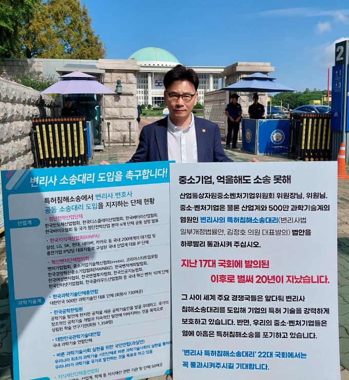 이날 1인 시위에서 김두규 회장은 “변리사법 개정안이 국회에 발의된 지 올해로 20년째”라며, “이번 22대 국회에서는 꼭 변리사법 개정안이 국회를 통과해 과학기술계와 산업계의 오랜 숙원이 해결되길 바라는 마음에서 국회로 나왔다”고 1인 시위의 배경을 밝혔다.